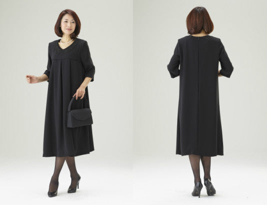 色は必ず黒で、光沢感のない素材で無地のワンピースやアンサンブル、スーツが基本です。