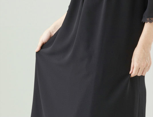 衿にケミカルレースを使用したエレガントなブラックフォーマルワンピース。袖丈と着丈を長めに設定しきちんと感を演出。胸元にタックを施し、前ファスナー仕様で着脱が楽にできます。袖部分には風通しのよい生地を使用しております。