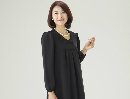 衿にケミカルレースを使用したエレガントなブラックフォーマルワンピース。袖丈と着丈を長めに設定しきちんと感を演出。胸元にタックを施し、前ファスナー仕様で着脱が楽にできます。袖部分には風通しのよい生地を使用しております。