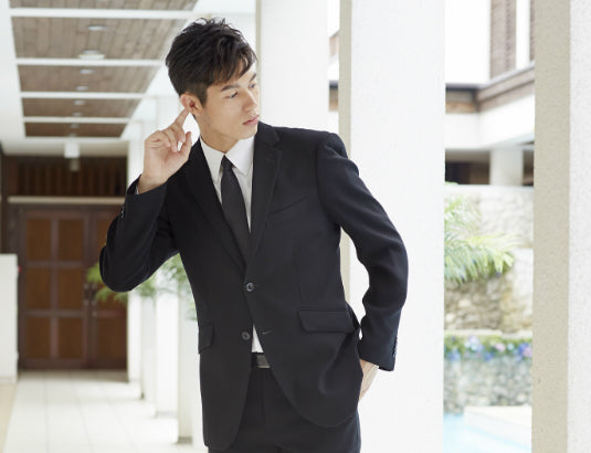 男性の方は、きちんとしたメンズ用ブラックフォーマルスーツを着用して、失礼のないように気をつけましょう。着こなすときは、サイズ感にも気を付けて。