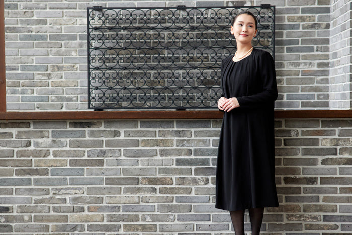 衿にケミカルレースを使用したエレガントなブラックフォーマルワンピース。袖丈と着丈を長めに設定しきちんと感を演出。胸元にタックを施し、前ファスナー仕様で着脱が楽にできます。袖部分には風通しのよい生地を使用しております。