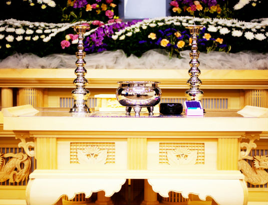 多くの斎場では祭壇前の焼香台でおこなう「立礼焼香」がほとんどで、喪主ならびに遺族は焼香される全ての人に一礼で返します。